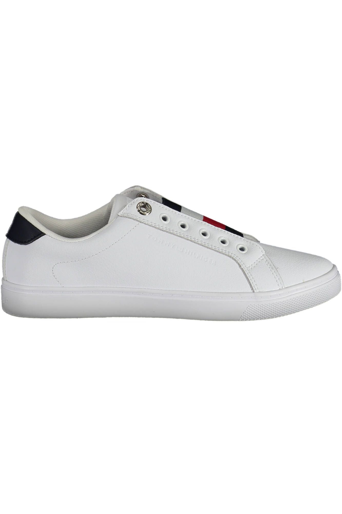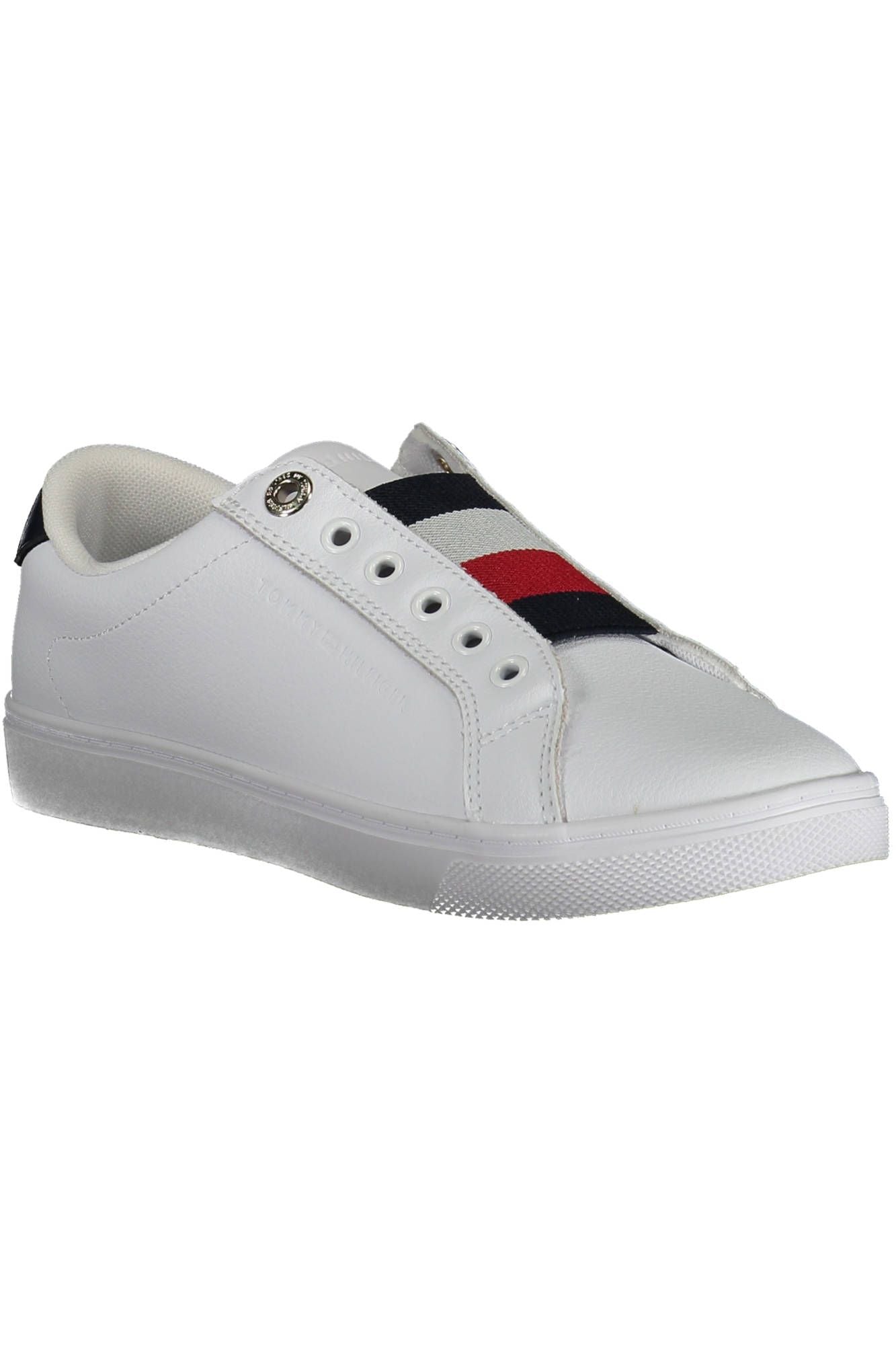 Step into sustainable style with these chic White Elastic Logo Sneakers from the renowned Tommy Hilfiger. Perfect for sporty endeavors or a casual day out, these shoes feature eye-catching contrasting details and the iconic logo, showing off your brand allegiance with every step. Crafted with a commitment to the environment, the smart blend of materials includes 50% recycled polyester for a greener footprint.