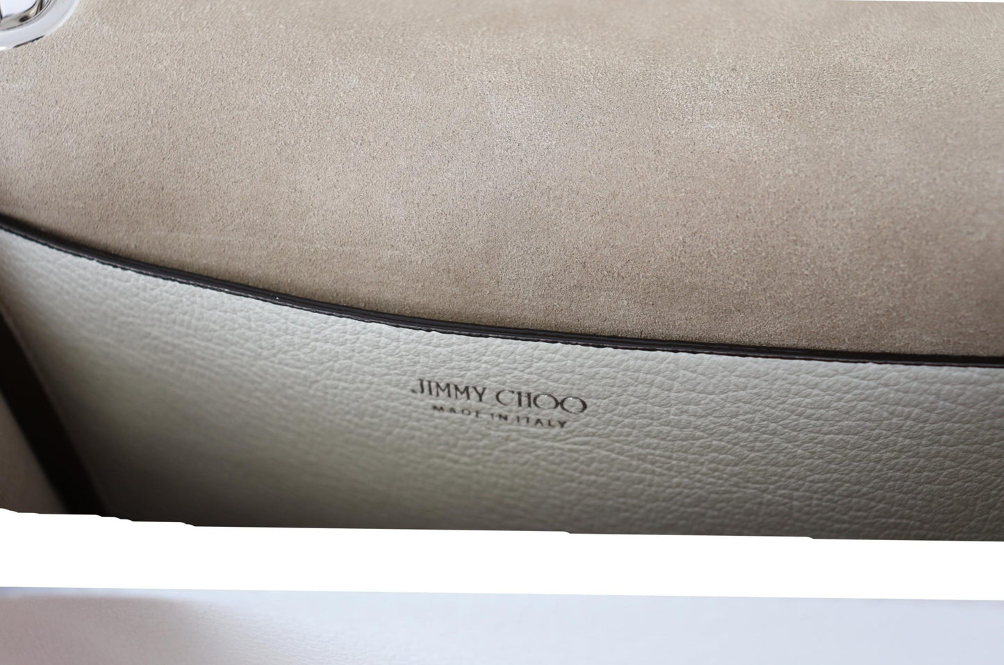 Indulge in the epitome of sophistication with this stunning white shoulder bag from the coveted label Jimmy Choo. Crafted with luxurious soft grainy leather, this exquisite accessory is perfect for any occasion, seamlessly transitioning from day to night. The bag features a secure magnetic closure, elegantly accented with metal logo detailing, and offers versatile wear with an adjustable shoulder strap. Whether you desire a shoulder bag or prefer a crossbody style, this bag provides both options with its 100cm strap. Boasting ample space for your essentials, its dimensions measure 26cm in length, 19cm in height, and 9cm in width.
