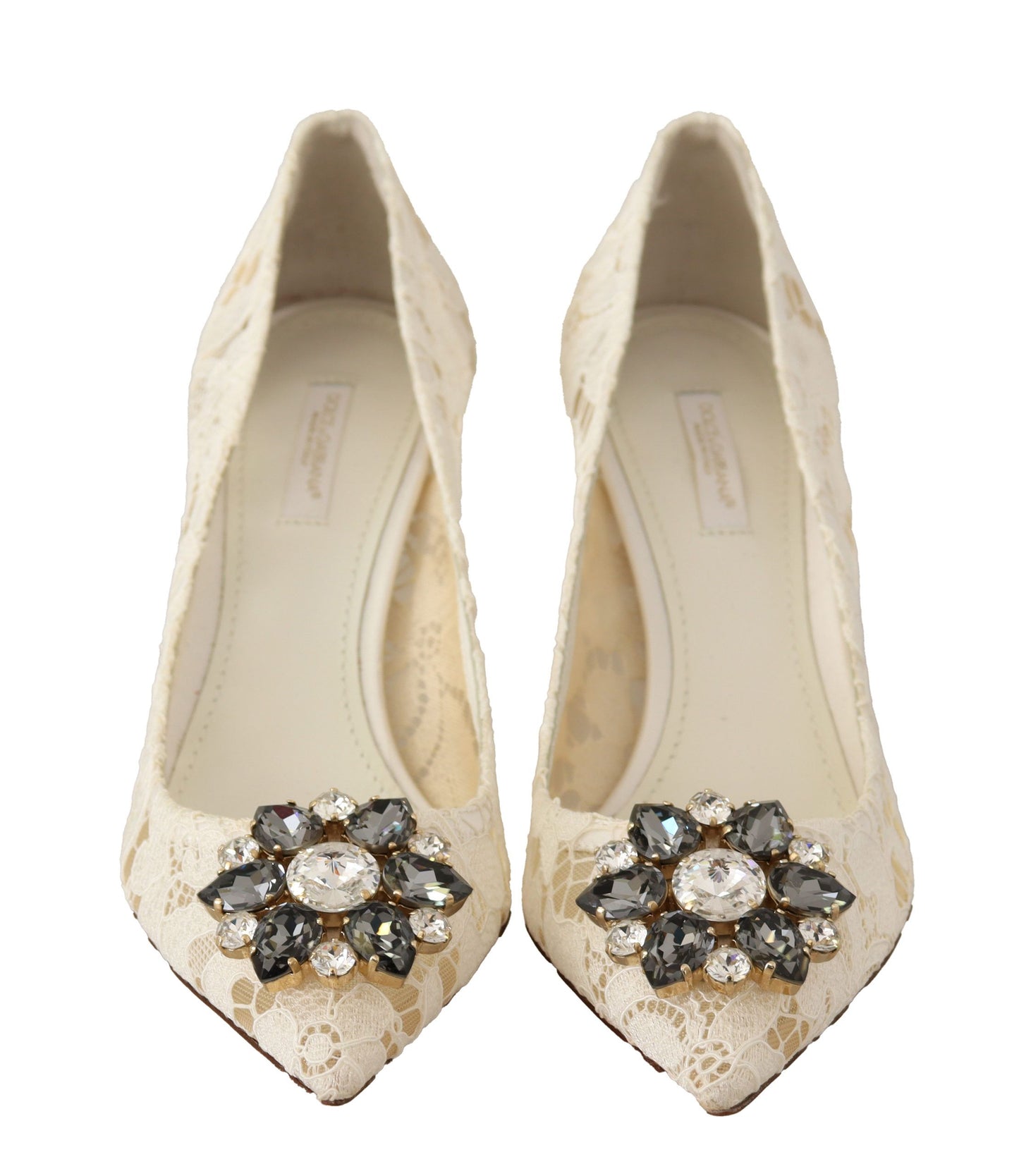 Step into luxury with these exquisite Dolce & Gabbana taormina lace heels, perfect for making a sparkling statement. With intricate crystals adorning the elegant white lace, these pumps from the Rainbow collection are a testament to timeless style and Italian craftsmanship. A leather bottom sole provides durability, while the logo detailing ensures brand recognition. Whether for a bridal event or an opulent evening affair, these heels are sure to dazzle.