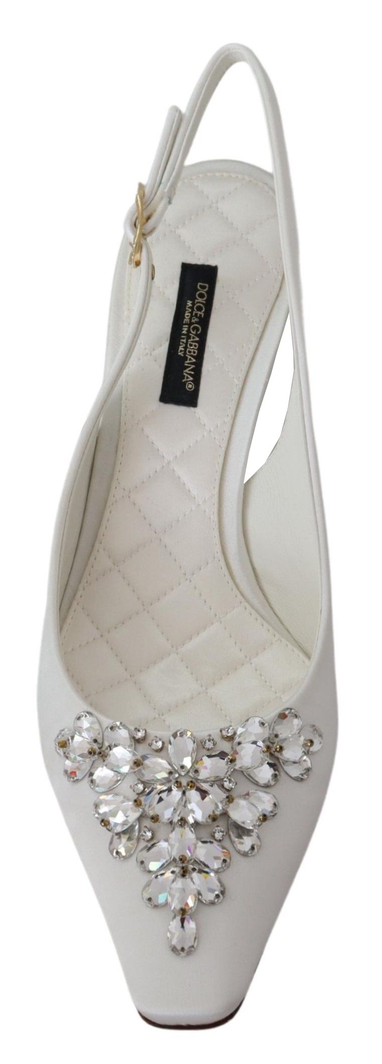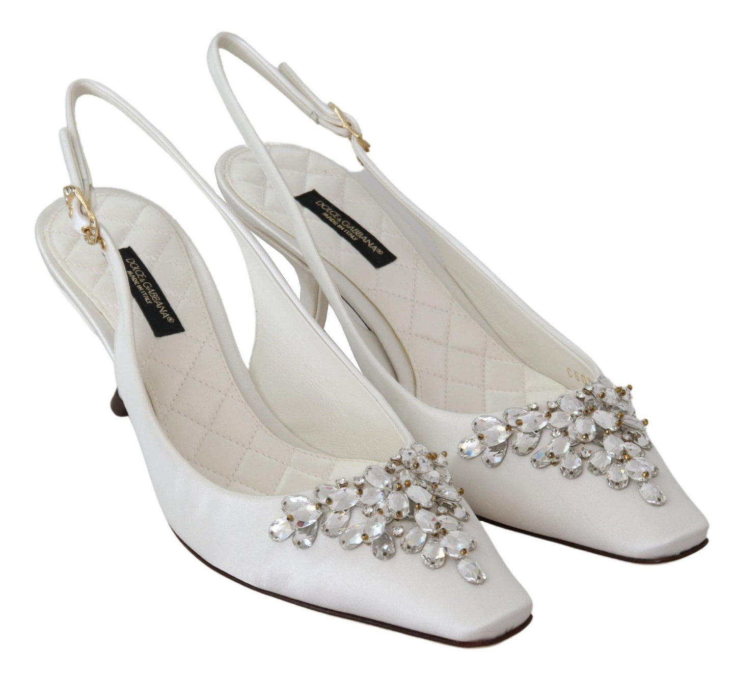 Step into elegance with these exquisite Dolce & Gabbana heels, brand new with tags. The slingback sandals feature a breathtaking floral crystal arrangement atop a sleek white textile silhouette, offering a perfect blend of luxury and craftsmanship. A must-have for any fashion connoisseur, these heels epitomize sophistication, destined to turn heads at any event.