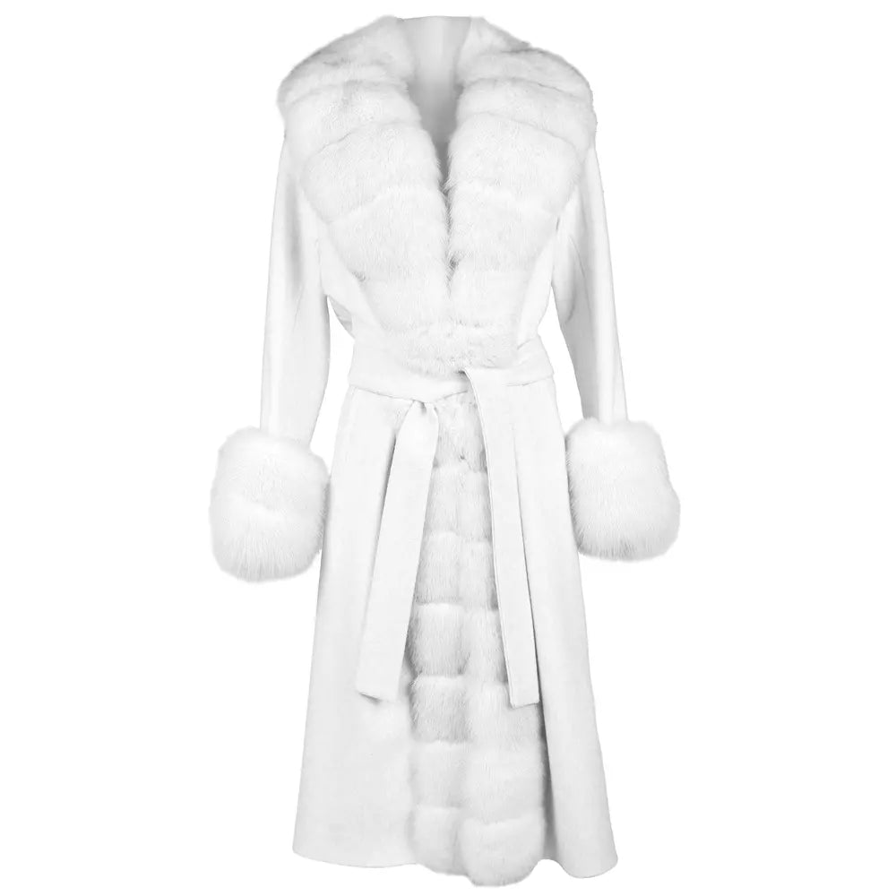 Indulge in the epitome of winter luxury with this sumptuous wool coat, accented with lavish fox fur along the collar, edges, and sleeves. Crafted with finesse in Italy using the finest Loro Piana fabric, this coat offers both warmth and unparalleled style. This refined piece features two side pockets for convenience, a graceful hook closure, and a chic ribbon belt designed to cinch your waist for a flattering silhouette.