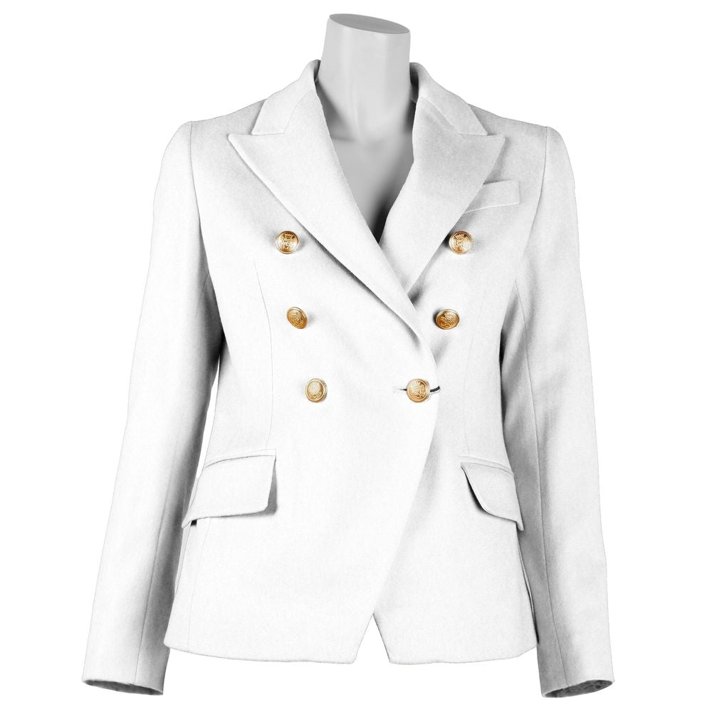 Elevate your wardrobe with this timeless double-breasted wool coat. Known for its refined elegance and classic design, this coat features a luxurious 100% virgin wool fabrication, complete with a high-fashion golden button closure. Its crisp white hue adds a touch of sophistication to any ensemble, while the two front pockets and a chest pocket blend functionality with style. The tone-on-tone internal lining ensures a seamless look, making this chic coat a must-have for the fashion-forward individual.