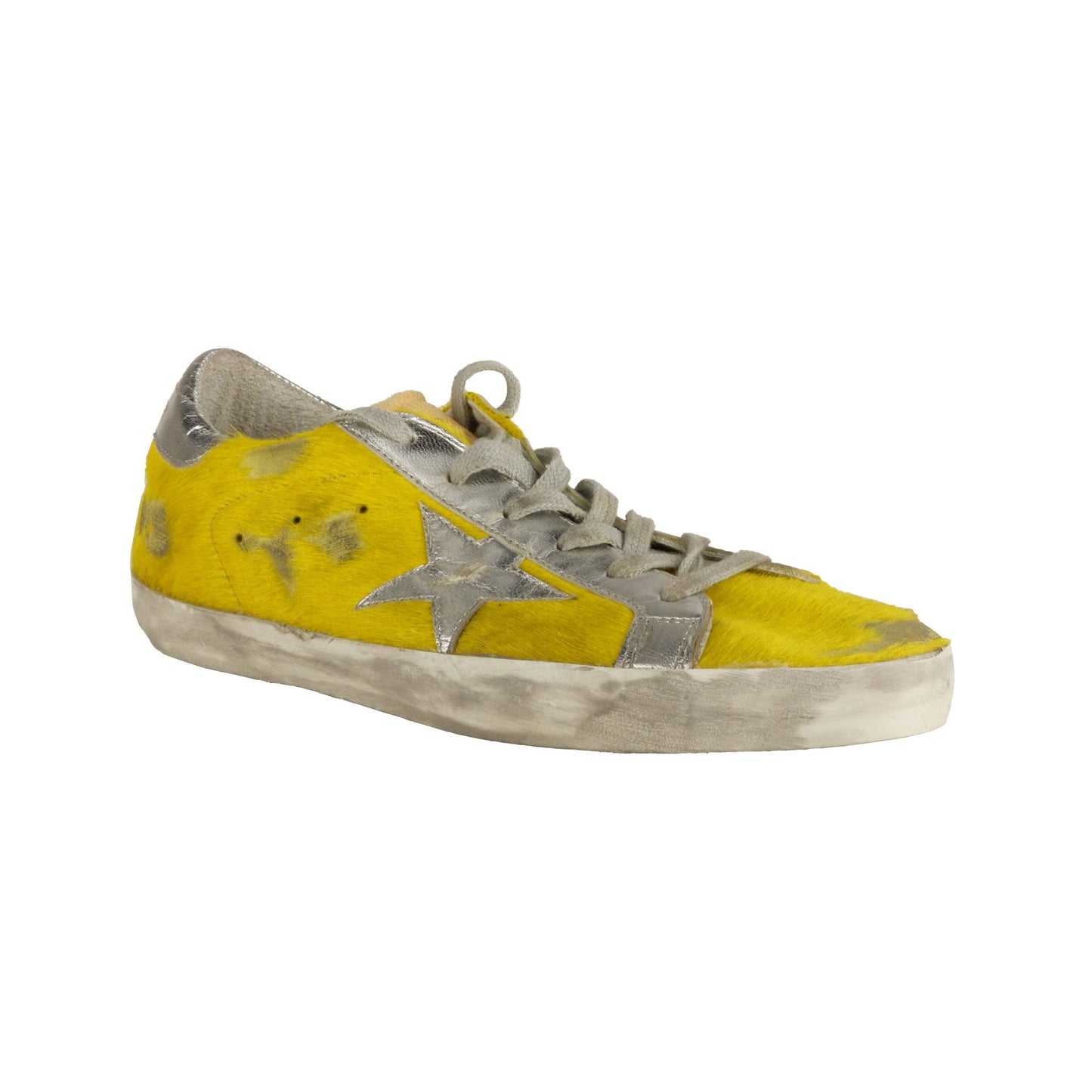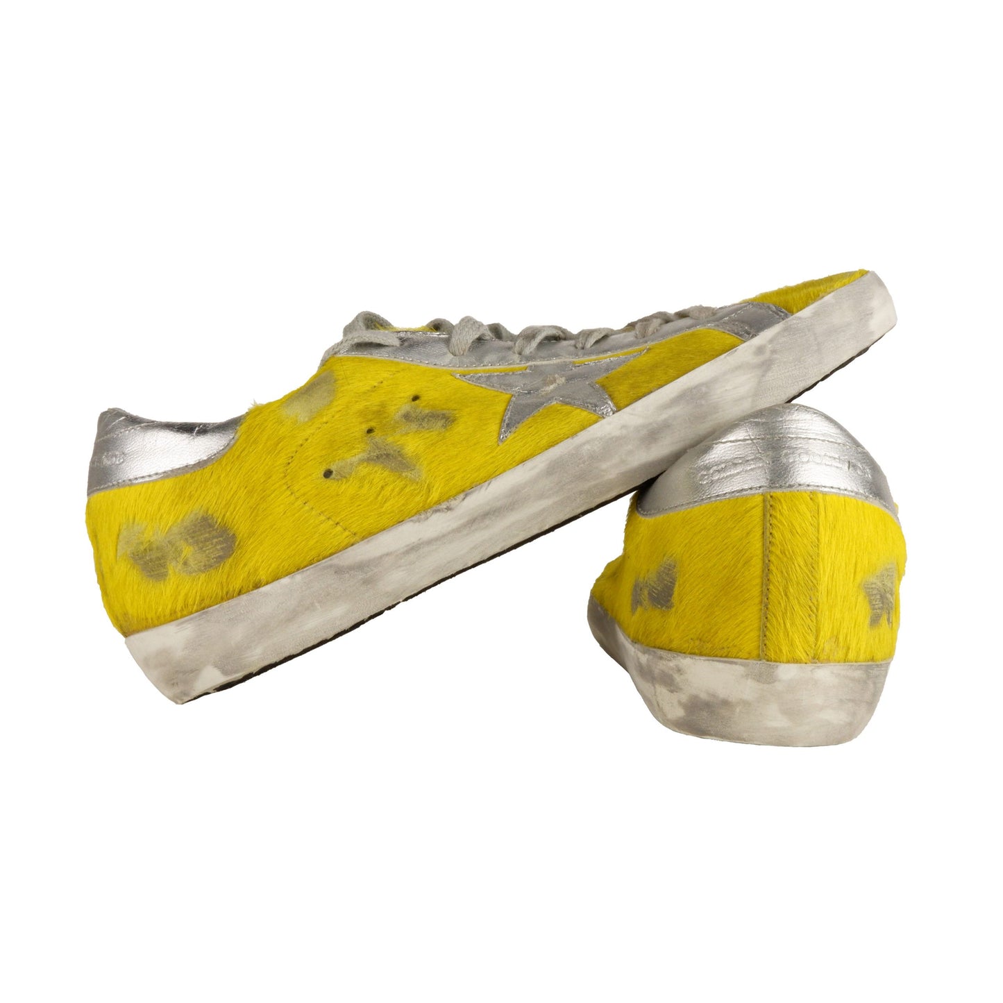 Elevate your sneaker game with these eye-catching leather sneakers adorned with luxurious yellow pony hair. These kicks make a bold statement with a sparkling silver star logo and patent leather accents, crafted with the utmost precision for both style and comfort. A robust rubber sole ensures durability. These Italian-made sneakers are a fusion of high fashion and practicality, perfect for those who don’t compromise on style or substance.