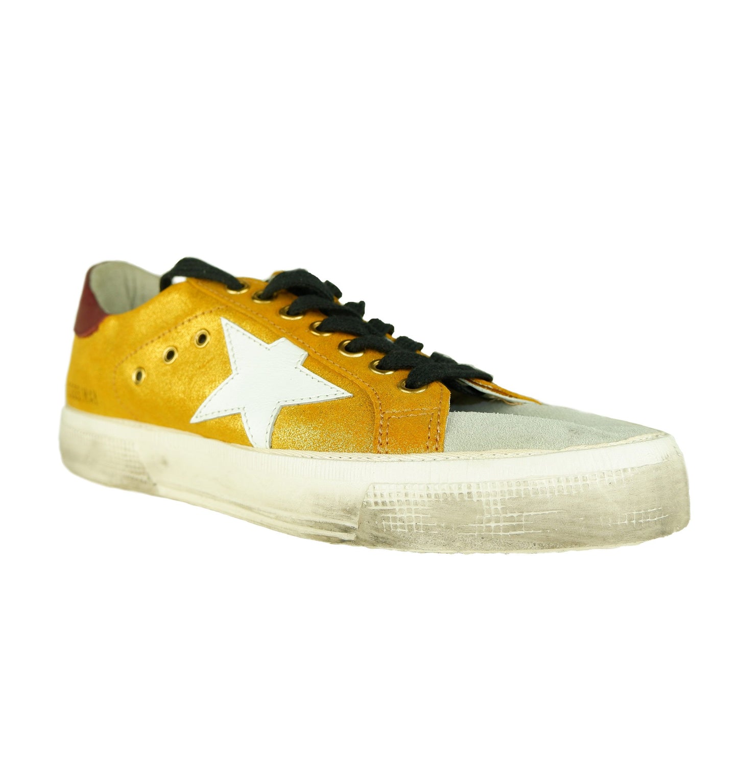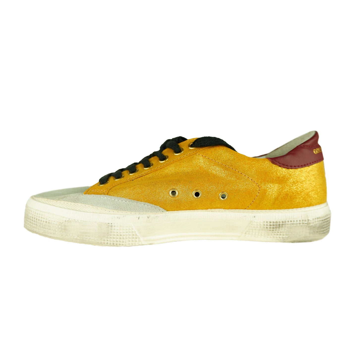 Elevate your sneaker game with these stunning patent leather kicks, featuring a glittered gold finish that commands attention. Crafted with a luxurious burgundy leather heel counter and a signature white star logo, these sneakers offer the perfect balance of flash and finesse. Designed for both comfort and style, the durable rubber sole ensures you can step confidently into any setting. Embrace Italian craftsmanship and add a splash of sparkle to your wardrobe today.