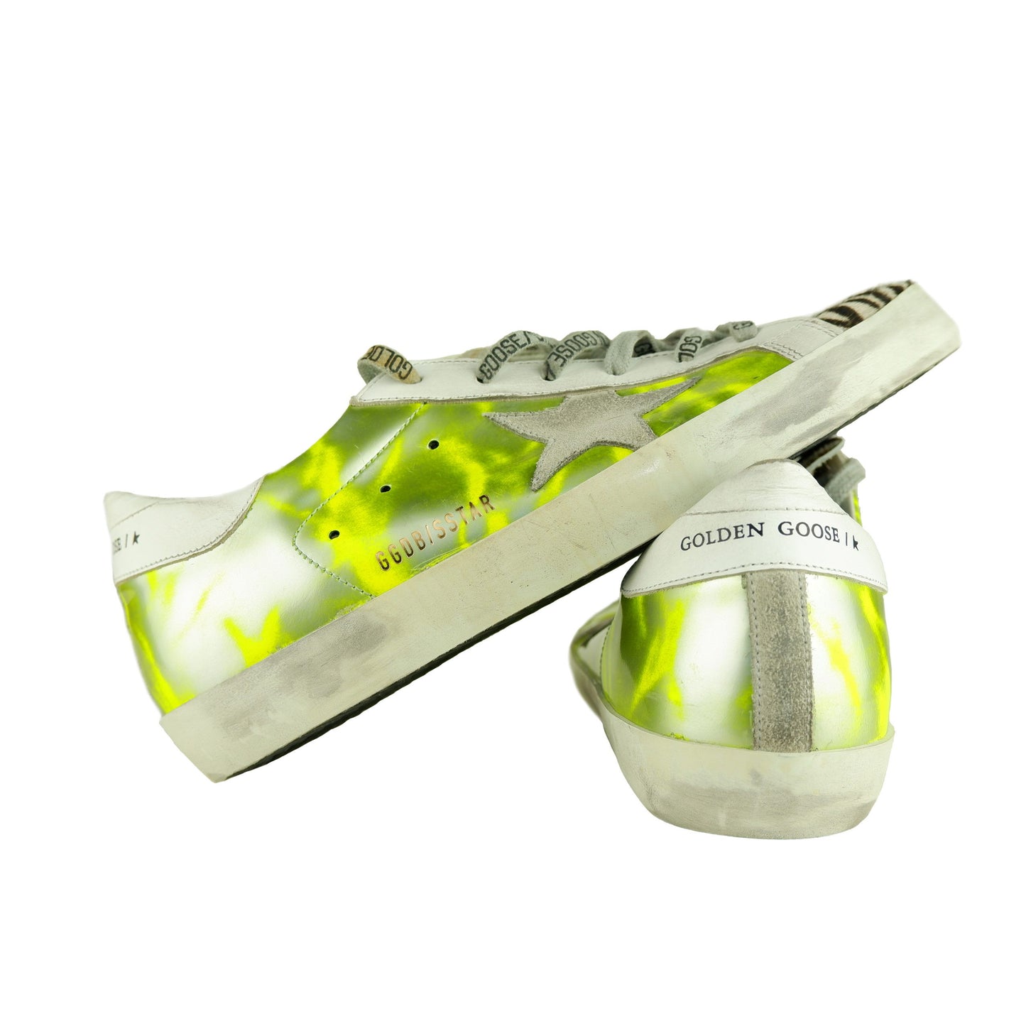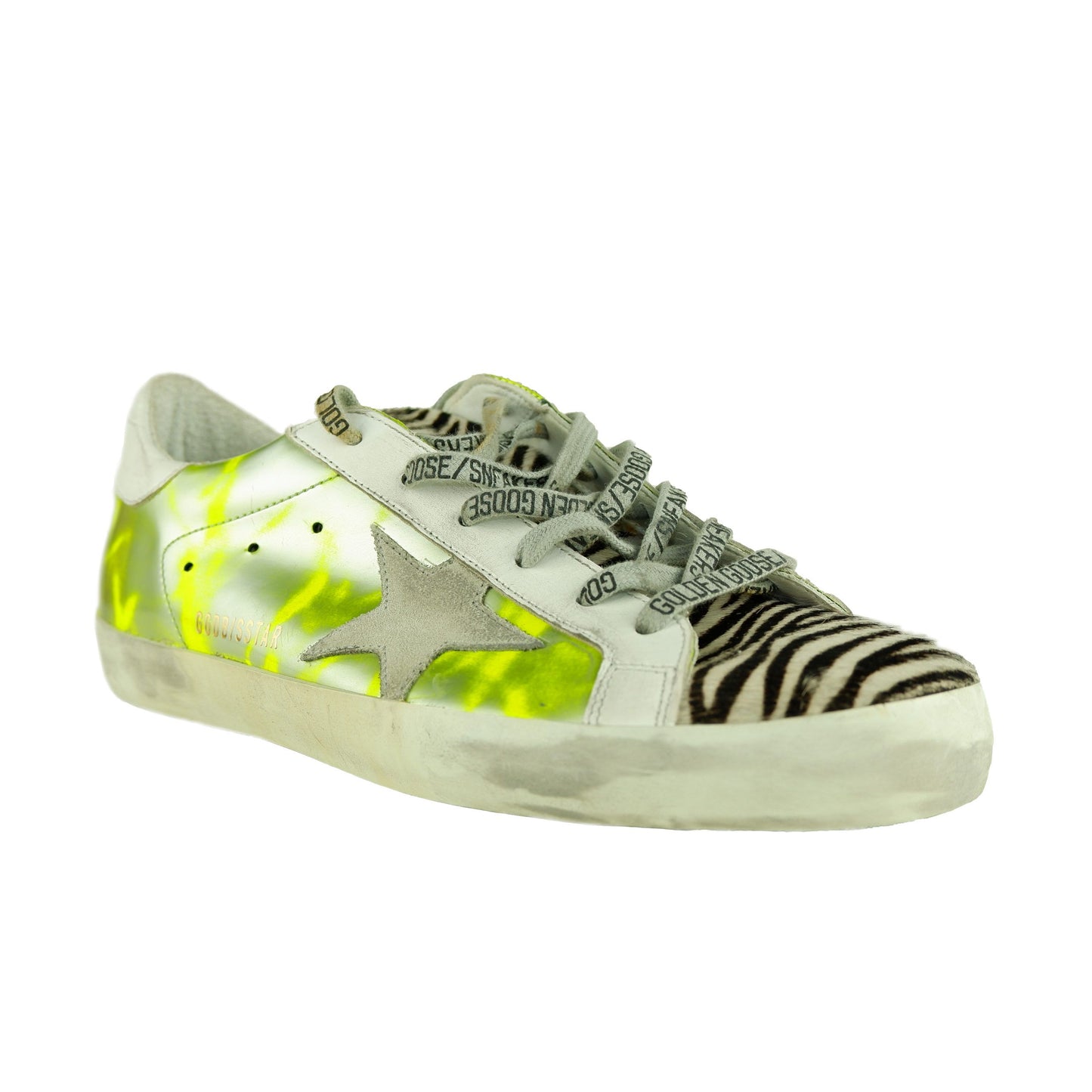 Step into luxury with these stylish women’s sneakers crafted from high-quality calfskin. They boast an eye-catching zebra print pony skin on the front, paired with a vibrant fluo yellow plastic coating along the sides, setting a bold fashion statement. The crisp white leather heel counter complements the unique design, while the signature star logo adds a touch of iconic charm. Built for both comfort and longevity, the sneakers feature a robust rubber sole, ensuring they are as durable as they are fashionable. Each pair is meticulously made in Italy, synonymous with exquisite craftsmanship and undeniable quality.