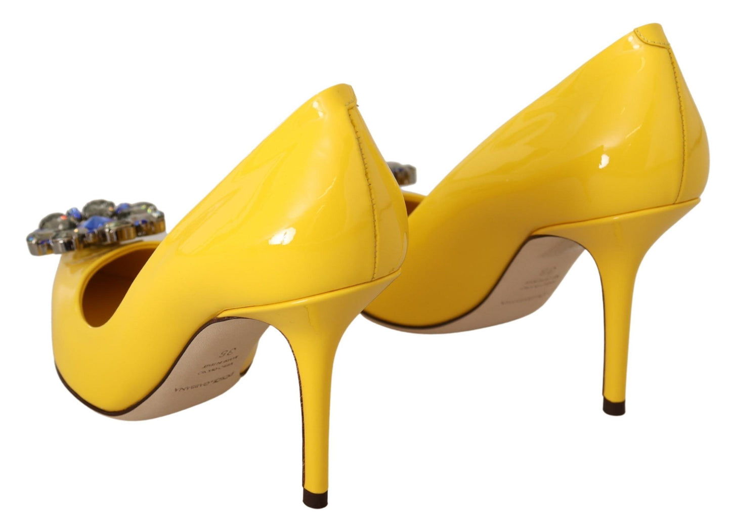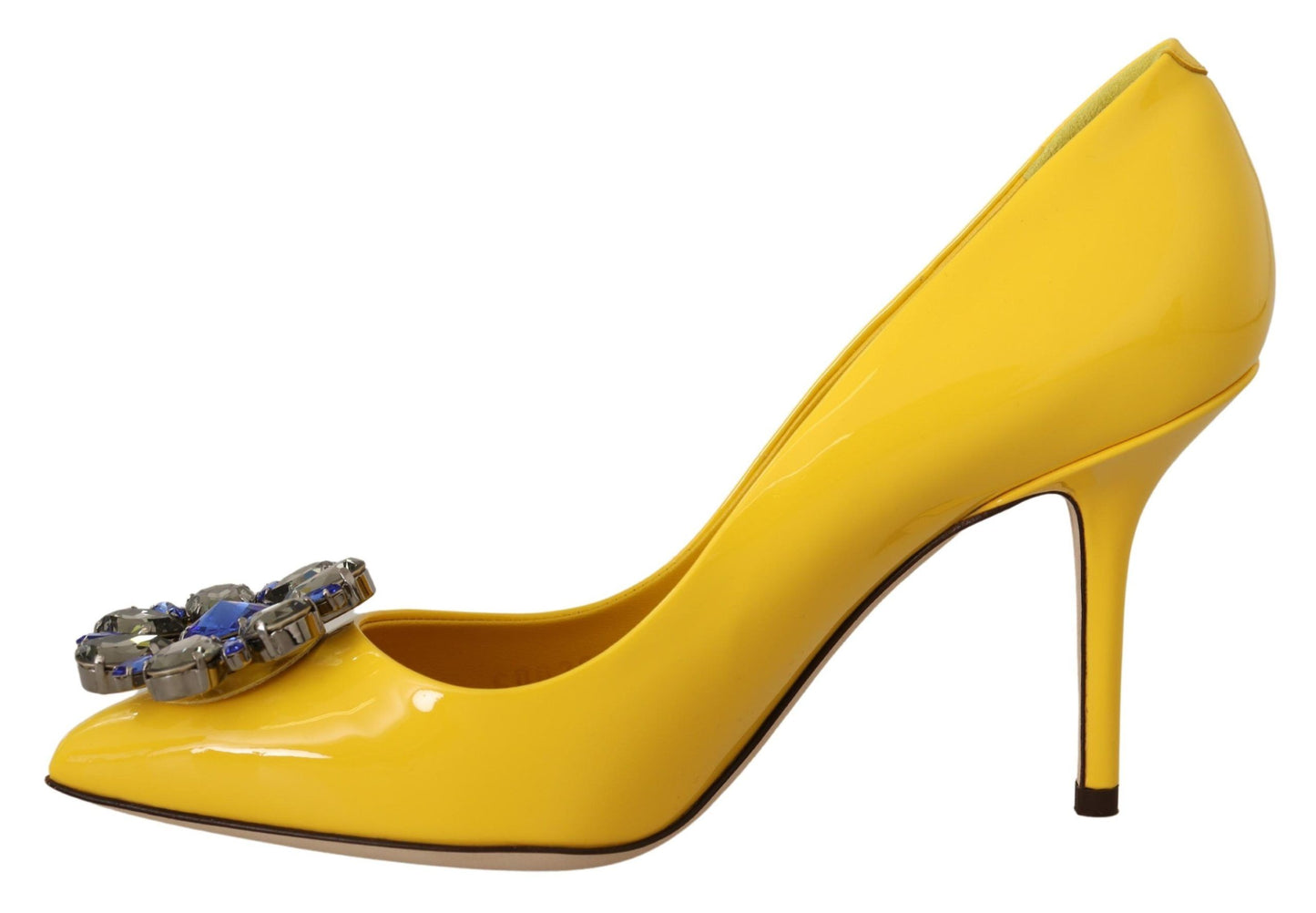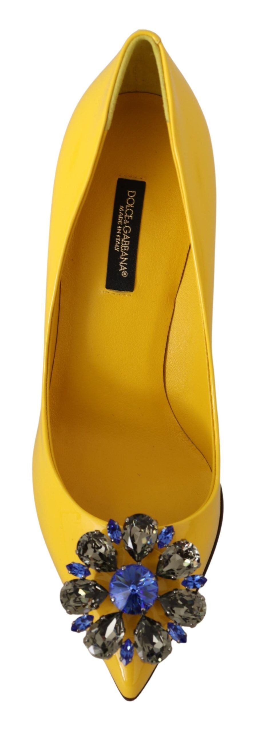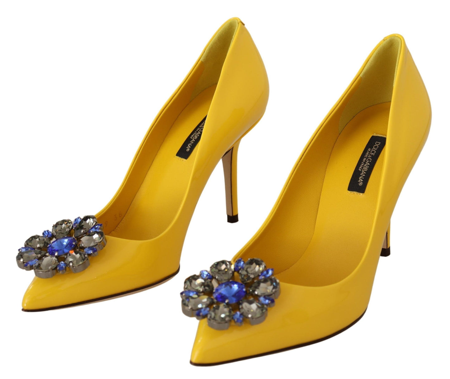 Step into a world of unparalleled elegance with these brand new Sunshine Yellow Leather Pumps. Adorned with sparkling blue-gray crystals, these Dolce & Gabbana heels are the epitome of luxurious fashion. Crafted from 100% patent leather with a leather sole, these classic heels offer both supreme quality and comfort. Perfect for any glamorous occasion, these Made in Italy pumps will light up any ensemble.