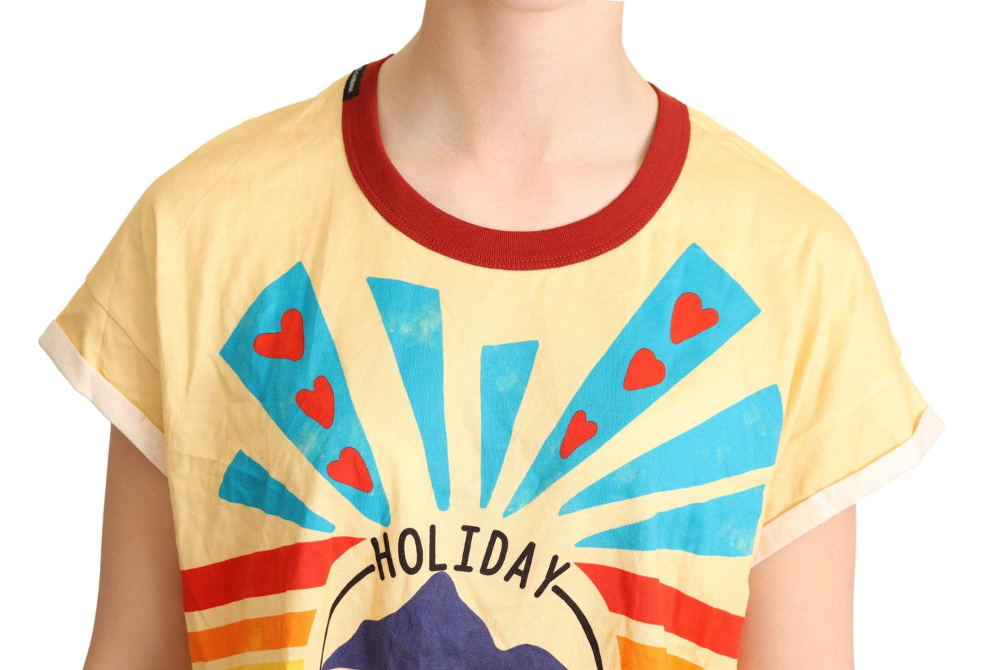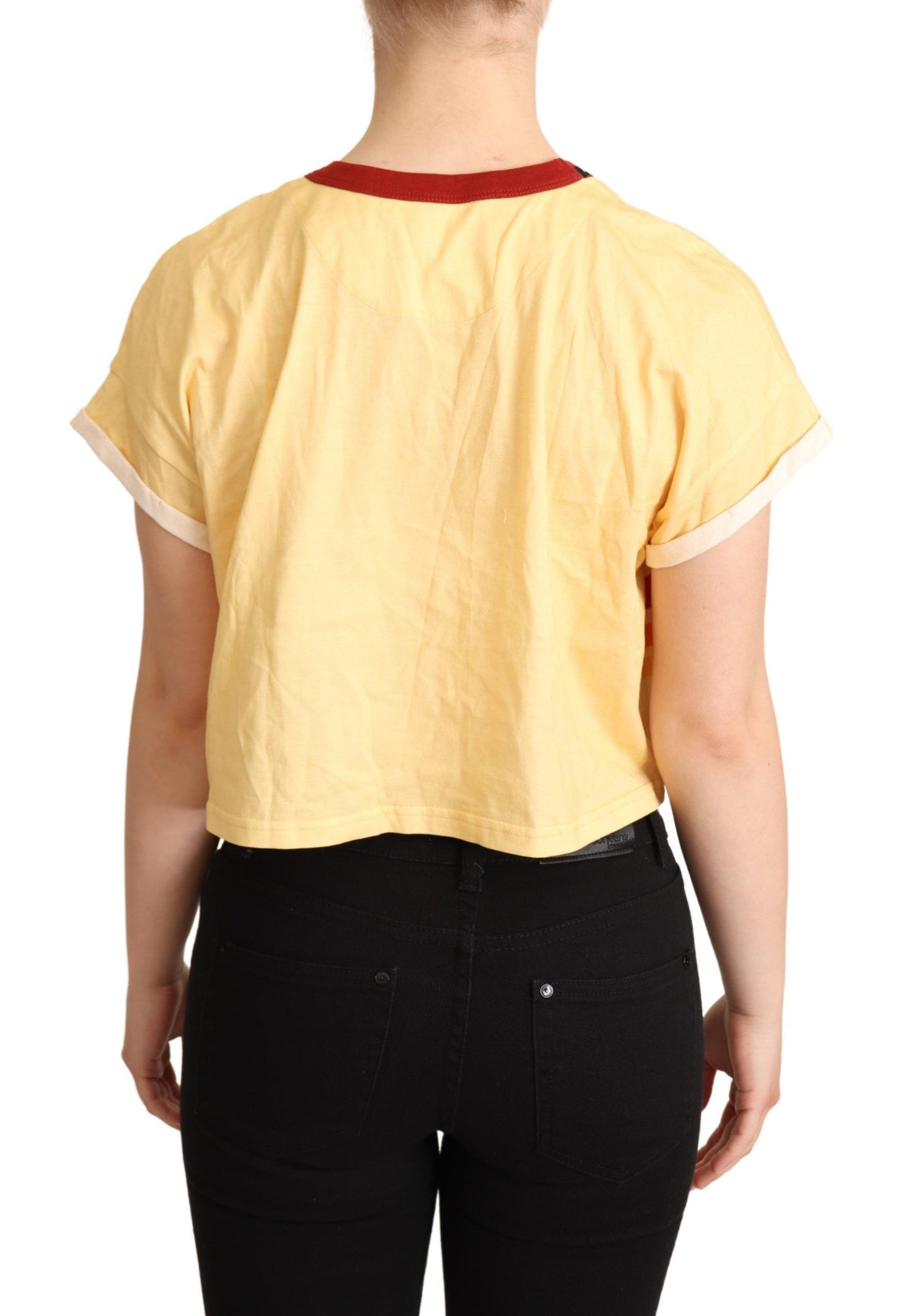 Indulge in Italian luxury with this vibrant Dolce & Gabbana cropped T-shirt. Boasting a bold multi-colored print, this tee is a testament to impeccable style and comfort. Crafted from soft cotton jersey, it features a striking contrast with burgundy piping along the round neckline that adds a dash of elegance to the casual silhouette.